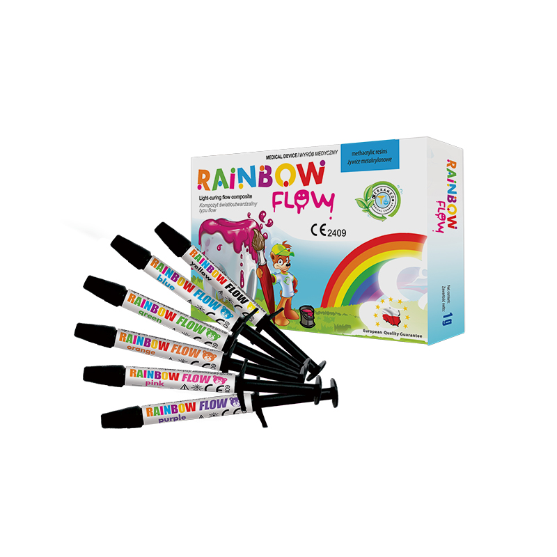 Svetlom tuhnúci zatekavý kompozit. Rainbow Flow bol navrhnutý pre deti. Má nízke polymerizačné zmršťovanie a vysokú pevnosť. K dispozícii v 6 živých a veselých farbách, ktoré vybrali najmenší pacienti.