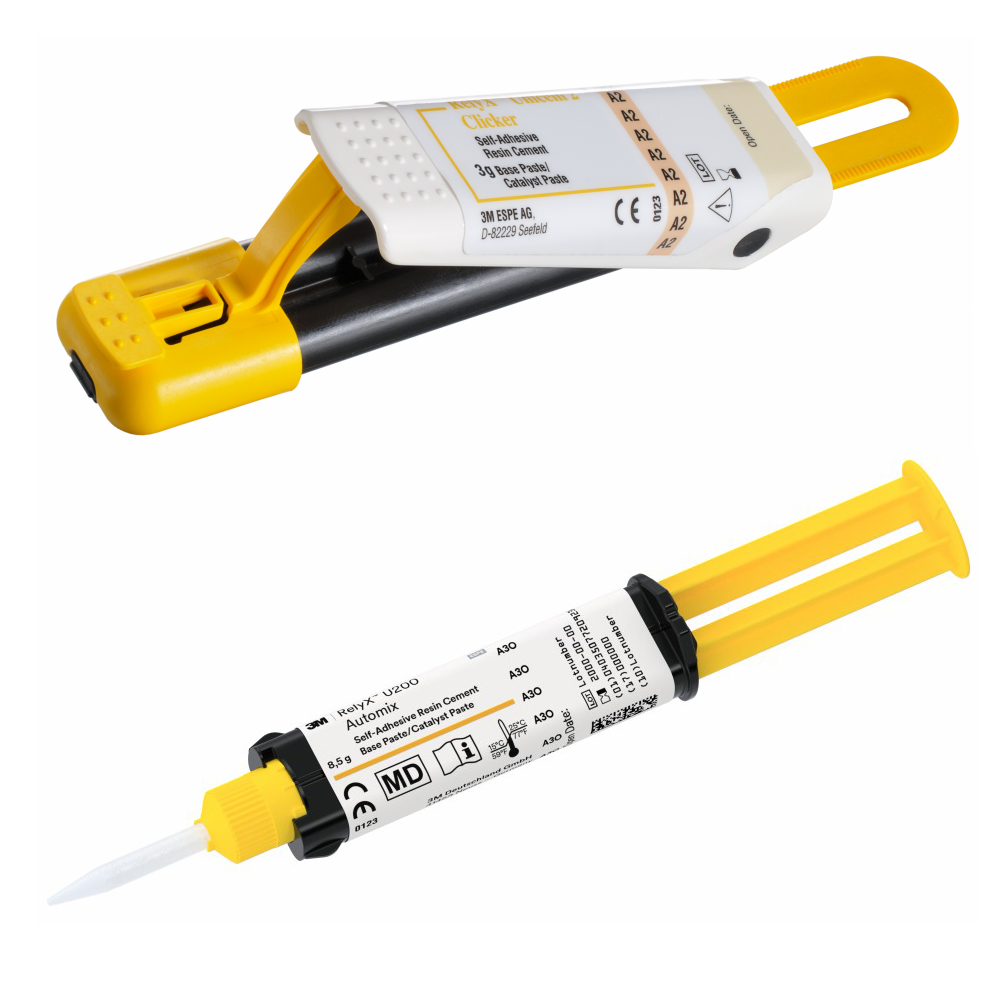 3M™ RelyX™ U200 samoadhezívny živicový cement – najnovšia generácia celosvetovo klinicky najviac overených samoadhezívnych živicových cementov. Určený na rôzne typy indikácií, ako sú: celokeramické, kompozitné alebo kovové inlay a onlay výplne, korunky a mostíky, čapy, trojčlenné inlay/onlay mostíky, celokeramické, kompozitné alebo kovové rekonštrukcie na implantátové abutmenty, dvoj- alebo trojčlenné Maryland mostíky. Dostupný v jednoducho použiteľnej samozmiešavacej striekačke Automix a dávkovači Clicker™.