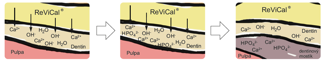 Princíp: materiál pozostáva z oxidu a kremičitanu vápenatého, na chemickej báze MTA. Kvôli vodnatej zložke obsiahnutej v dentínovej tekutine sú po aplikácii vysoko hydratované MTA-plnivom. Dochádza k výmene iónov, pretože ReViCal účinne uvoľňuje ióny Ca2+ a OH-. Hodnota pH je lokálne zvýšená na úroveň okolo pH 12. Vďaka tejto vysokej alkalickej hodnote a navyše prirodzenému gradientu medzi vnútornou a vonkajšou bunkovou membránou bude dochádzať k narušovaniu membránového potenciálu buniek. Bunkový metabolizmus, rast buniek a delenie buniek je inhibované a tým je indukovaná apoptóza – bunková „smrť“. Touto cestou ReViCal pôsobí vo vysokej miere baktericídne.