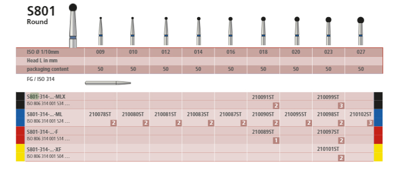 Viacvrstvové diamantové vrtáčiky s hrotom v tvare kužeľa so zaobleným koncom, mandrel FG ISO 314.