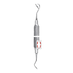 Parodontologický nástroj obojstranný z ušľachtilej ocele na oblasť molárov, s ergonomickou rukoväťou ErgoForm, celková dĺžka 16,7 cm.
