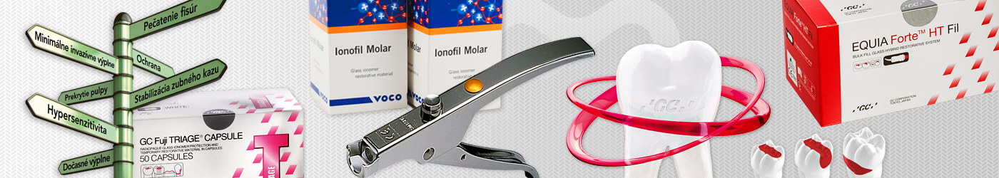 Výplňové materiály, ktoré sa skladajú zo sklenenej anorganickej zložky (oxid kremičitý, oxid hlinitý, oxid vápenatý), organickej kyseliny polyalkenoátovej a reakčného média. Materiál má niekoľko zaujímavých vlastností ako je spoľahlivá väzba na sklovinu a dentín, uvoľňovanie fluoridov a biokompatibilita. Ďalšou výhodou v porovnaní s kompozitmi je rýchlosť spracovania - nie je potrebný koferdam a ani zložitý adhezívny protokol. Dominantné zastúpenie v našom sortimente majú skloionoméry GC. Nájdete tu však aj materiály 3M a VOCO.