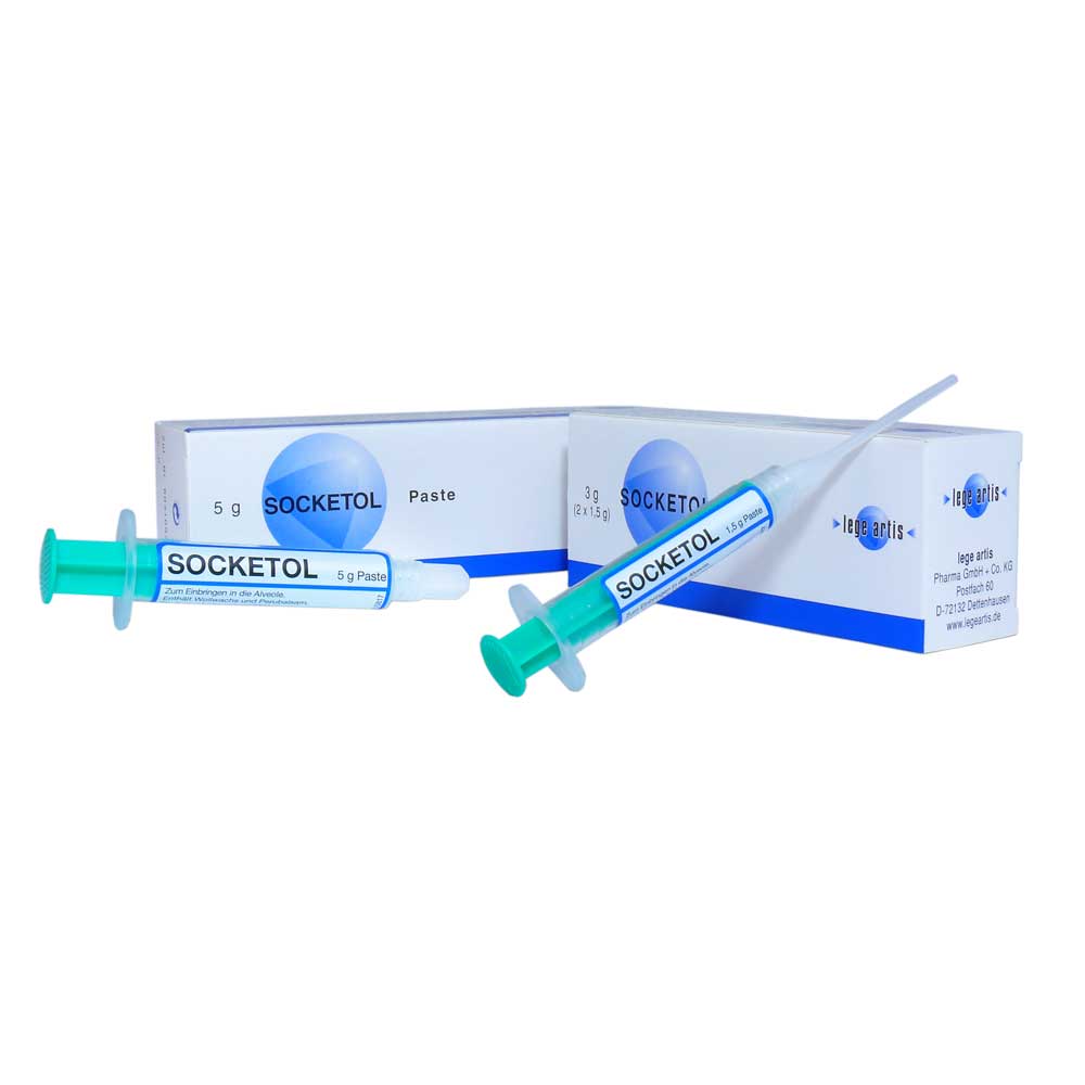 Zloženie: 1 g pasty obsahuje: 150 mg lidokaín hydrochloridu 1 H2O, 100 mg fenoxyetanolu (Ph. Eur.), 5 mg tymolu a 30 mg peruánskeho balzamu. Ďalšie zložky: tuk z vlny Ovis aries, hymetelóza, dimetikón (visc. = 100 cSt.) a eukalyptový olej. Indikácie: Prostriedok na ošetrenie rán po extrakcii zubov. Utišujúci a antiseptický prostriedok na aplikáciu do zubných lôžok. Kontraindikácie: SOCKETOL sa nesmie používať u pacientov, ktorí sú alergickí alebo precitlivení na peruánsky balzam, škoricu alebo niektorú z ďalších zložiek lieku. To platí aj pre pacientov, ktorí sú precitlivení na škoricu (alergia). U pacientov, ktorí sú alergickí na lokálne anestetiká typu amidov kyselín alebo u pacientov, ktorí hlásia nežiaduce účinky (najmä príznaky intoxikácie) spojené s predchádzajúcim lokálnym anestetikom. Vedľajšie účinky: Vzhľadom na lidokaín, peruánsky balzam a eukalyptový olej obsiahnutý v paste sa v ojedinelých prípadoch môžu vyskytnúť alergické reakcie. Peruánsky balzam a tuk z vlny môžu spôsobiť kožné reakcie. Upozornenia: Obsahuje tuk z vlny a peruánsky balzam. Venujte pozornosť príbalovému letáku. Dátum aktuálnej informácie: 07/2017