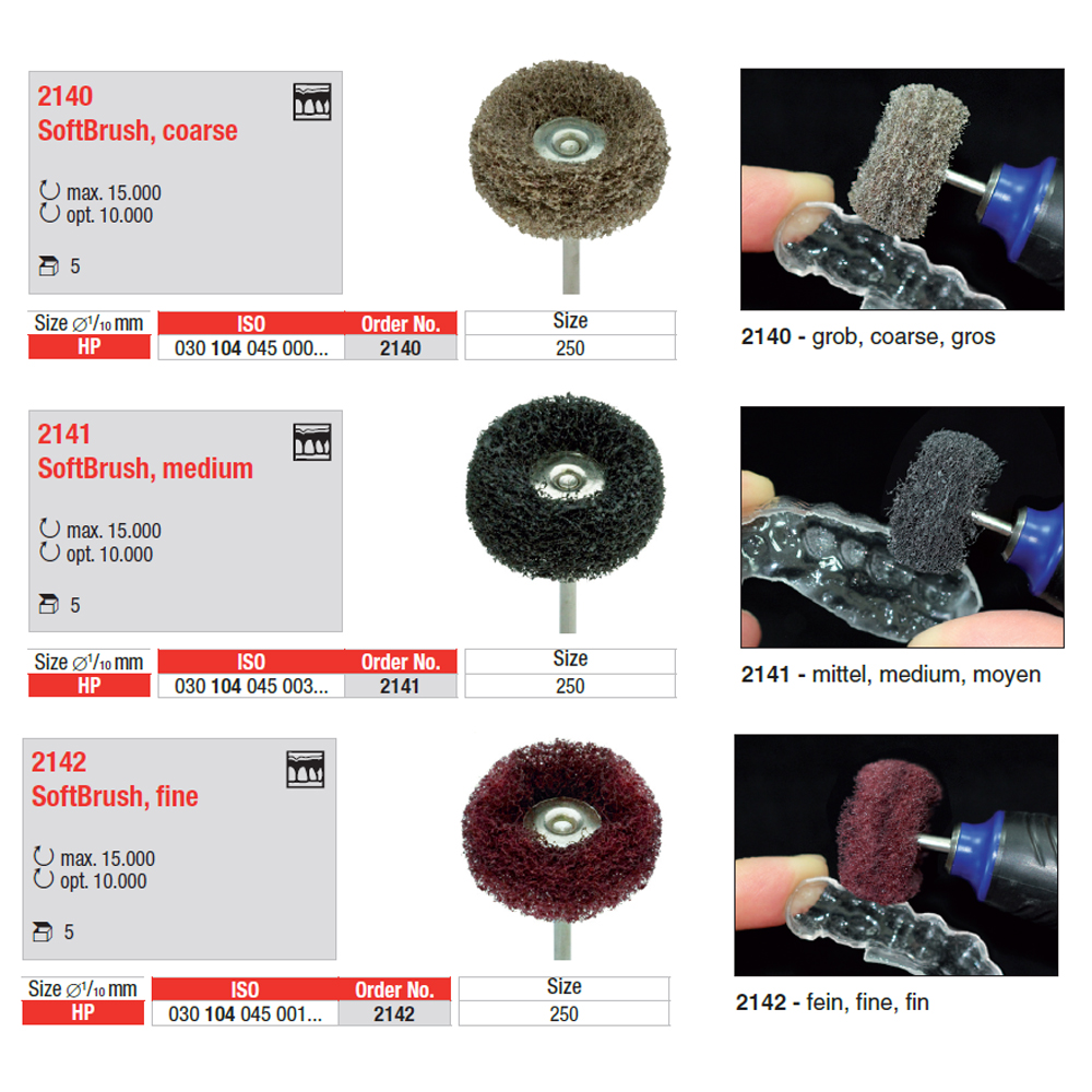 Použitie: príprava povrchu mäkkých rebazácií, chráničov úst, vákuovo tvarovaných fólií, odtlačkových podložiek, akrylových zubných protéz, kompozitných fazetových koruniek atď., na satinovanie jemne pripravených okluzívnych povrchov z drahých kovov.