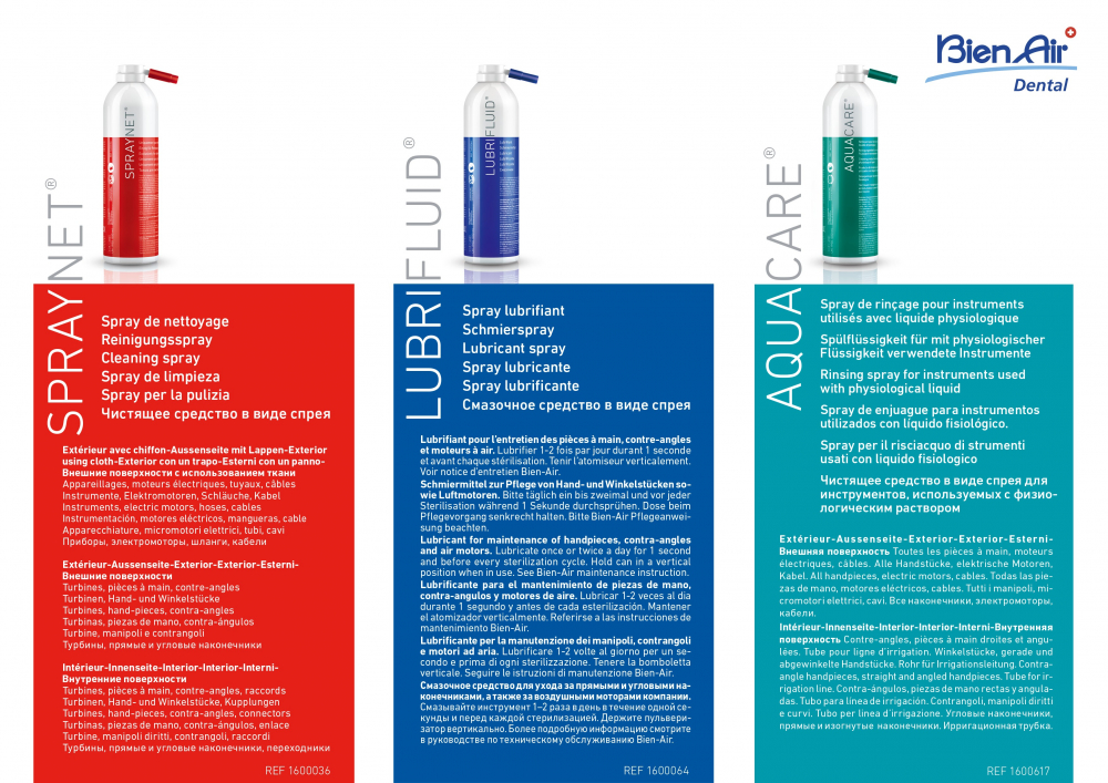 Jednoduchosť a účinnosť: tieto dve slová dokonale vystihujú rad produktov údržby Bien-Air. Poskytujú vám dokonalú pomoc pri každodennom používaní vašich obľúbených nástrojov. Rad produktov údržby Bien-Air zahŕňa štyri rady: Aquacare, Spraynet, Lubrifluid a Lubrimed. Každý produkt je vyrobený pre špecifickú fázu čistenia a/alebo mazania a spolupracujú, aby poskytli vašim nástrojom dokonalú hygienu a bezkonkurenčnú životnosť.