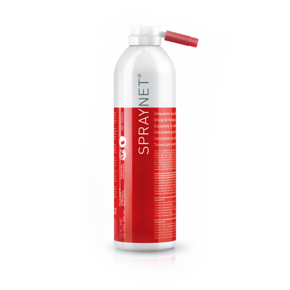 Čistiaci sprej Spraynet 500 ml je určený na čistenie vonkajších plôch s handričkou a na čistenie vonkajších a vnútorných povrchov turbínok a kolienok striekaním.