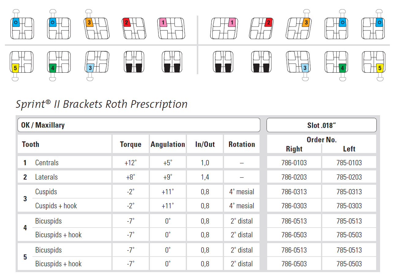 | 268950007 | SPRINT II Brackets, Roth .018 Cuspids, T-2°, A+11°, I/O0,8, R4°mes, L
