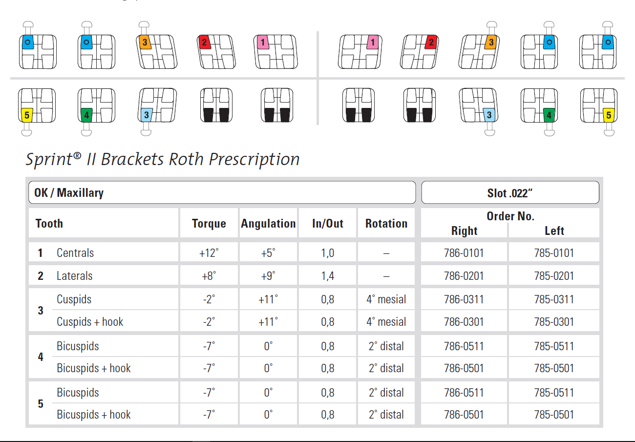 | 268950033 | SPRINT II Brackets, Roth .022 Bicuspids, T-7°, A0°, I/O0,8, R2°dist, L