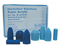 Nástroje špeciálne vyrobené na leštenie akrylátov. Tmavomodrý leštiaci nástroj sa používa v priebehu počiatočnej fázy leštenia. Zahladí drsné a nerovné oblasti náhrad bez poškodenia zubov. Jemný svetlomodrý leštiaci nástroj pripraví náhrady pre záverečné lathe leštenie. Maximálna rýchlosť 15.000 otáčok za minútu. K dispozícii v štyroch tvaroch s mandrelom a samostatne.