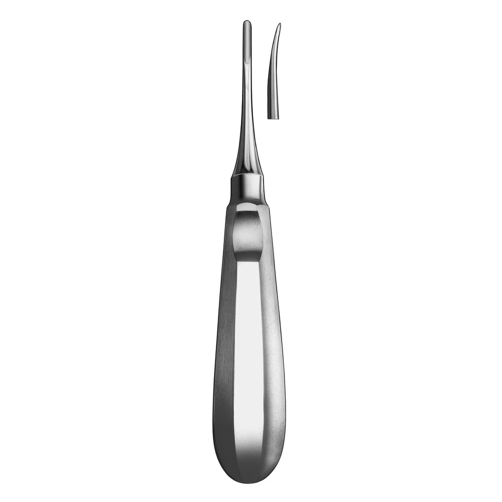 Stomatologický nástroj na prerušenie väzív fixujúcich zub. Mimoriadne plochý a ostrý tvar umožňuje veľmi jemný prienik do parodontálnej medzery.