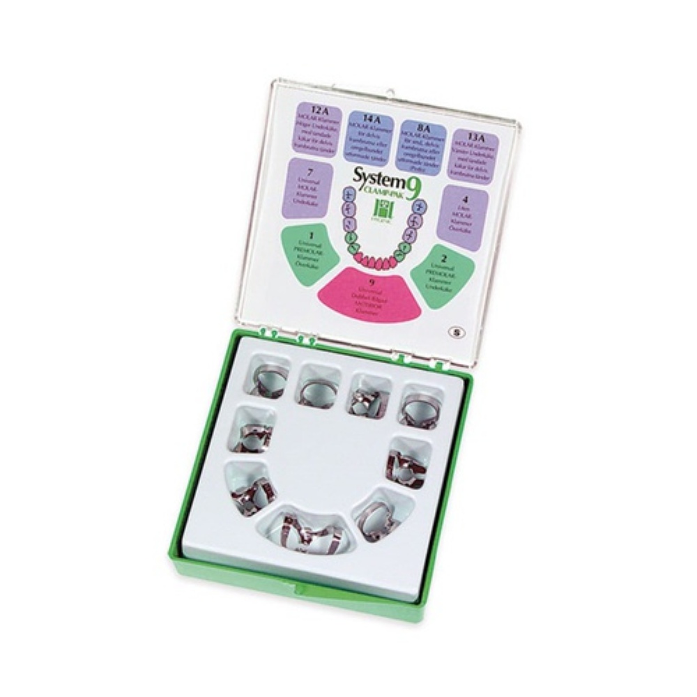Sada 9 oceľových svoriek na kofferdam Dental Dam, č. 1, 2, 4, 7, 8A, 9, 12A, 13A, 14A.