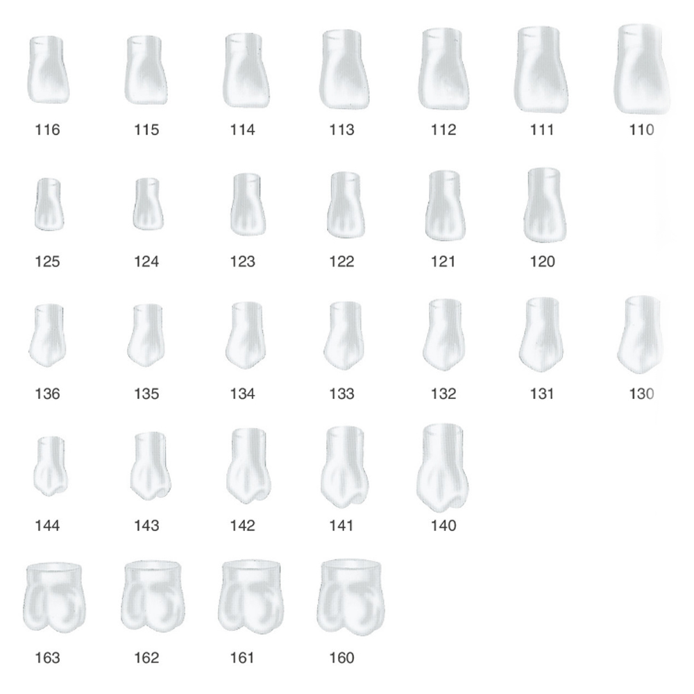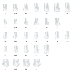 Priesvitné korunky nemeckého výrobcu Frasaco pre pravú hornú časť chrupu, čísla 110 až 163.