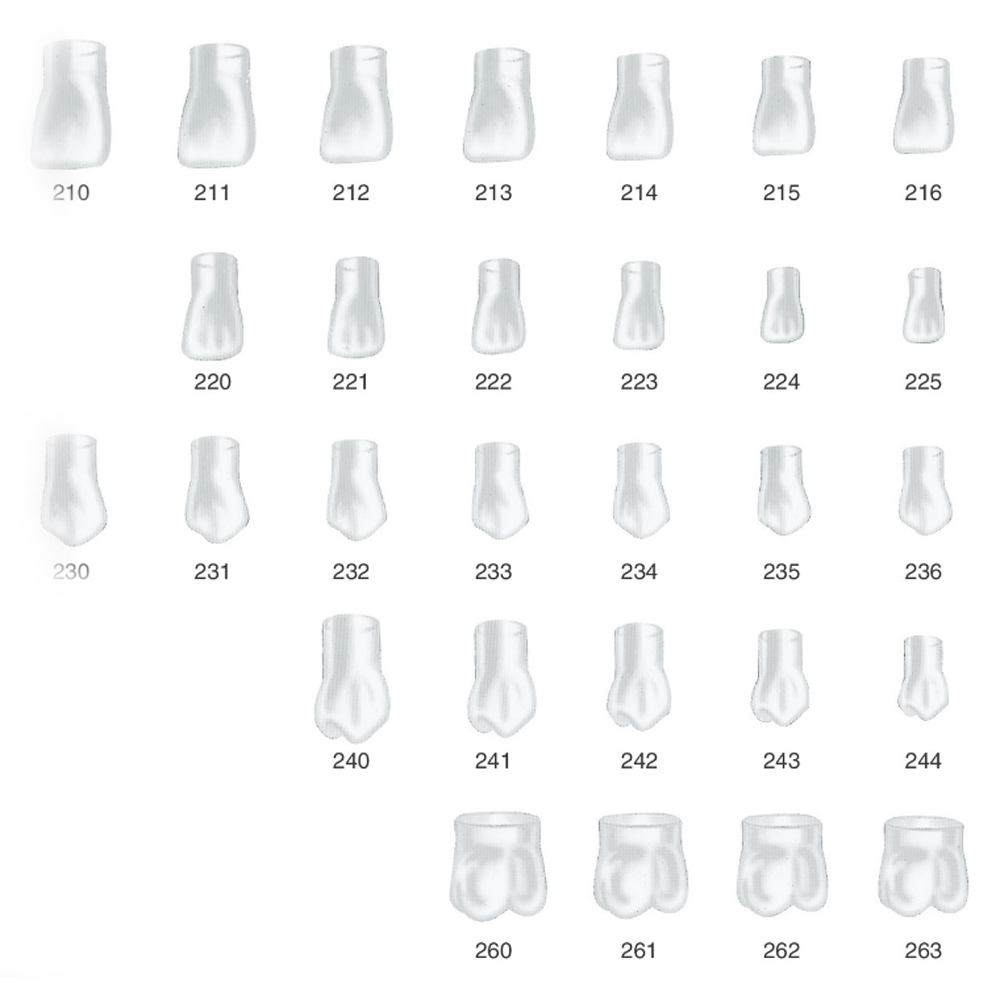 Priesvitné korunky nemeckého výrobcu Frasaco pre ľavú hornú časť chrupu, čísla 210 až 263.