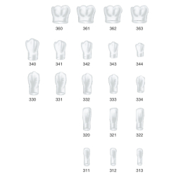 Priesvitné korunky nemeckého výrobcu Frasaco pre ľavú dolnú časť chrupu, čísla 311 až 363.