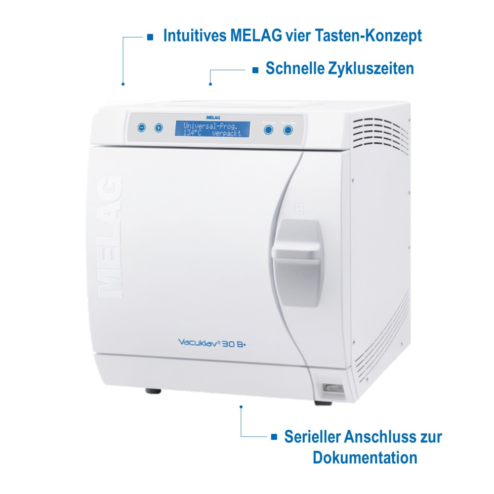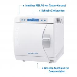 Samostatné zásobovanie vodou, dĺžka komory 35 cm. Osvedčená spoľahlivosť: vďaka krátkym sterilizačným cyklom, ľahkej obsluhe a praktickej dokumentácii je Vacuklav 31 B+ energeticky efektívne riešenie pre sterilizáciu v lekárskej alebo zubnej ambulancii a na klinike.