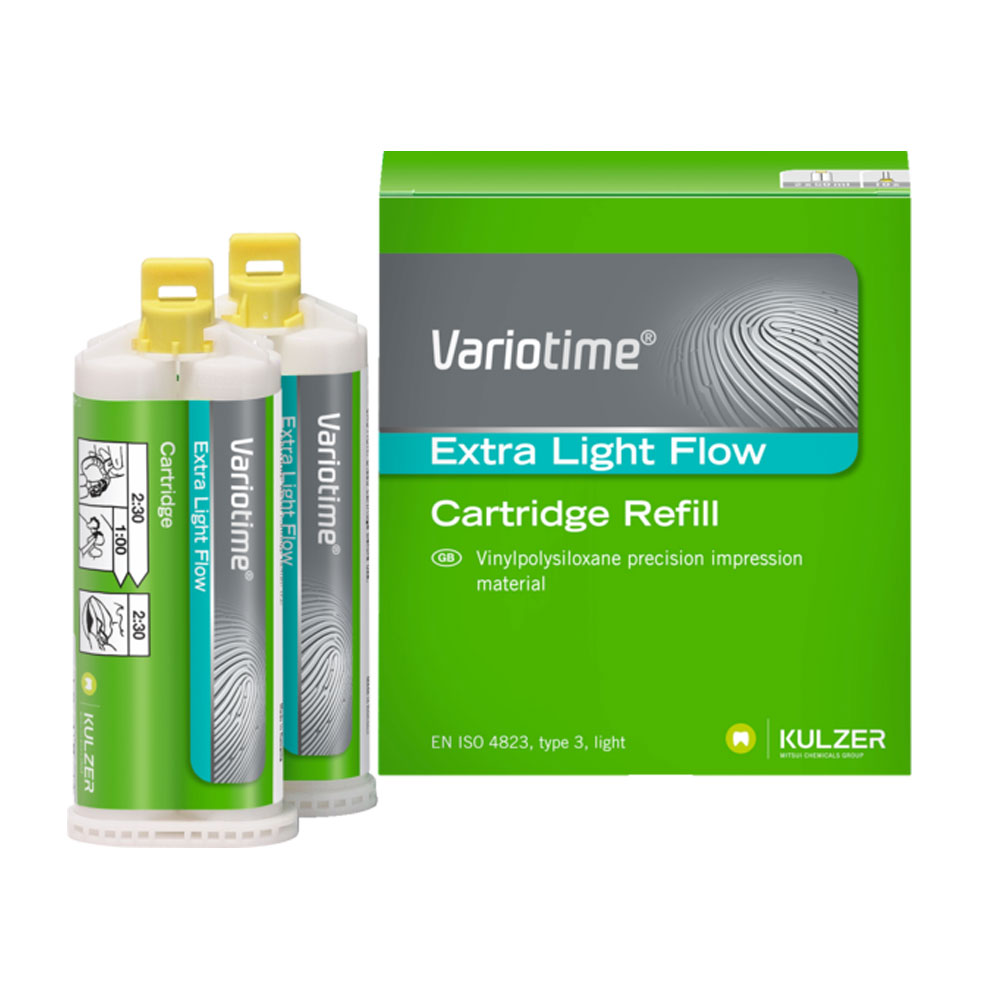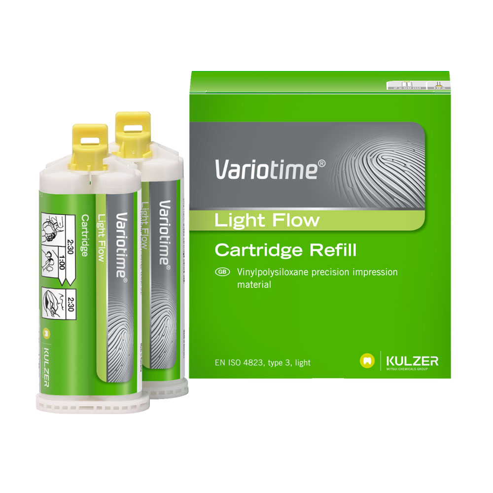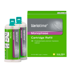 Variotime je inovatívny A-silikón, ktorý garantuje výborné výsledky a je variabilný pri zhotovovaní odtlačku. Variotime kontroluje rýchlosť tuhnutia odtlačkovej hmoty teplotou v ústnej dutine a tuhne rýchlo po vložení do úst.