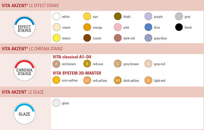 VITA AKZENT LC sú kompozitné farby vytvrdzované na svetle na reprodukciu individuálnych farebných efektov a na realizáciu farebných korektúr. Systém farieb presviedča okrem mnohostrannosti účinnou presnou aplikáciou farieb a dobrou odolnosťou farieb resp. lesku. Farby je možné univerzálne použiť pre extraorálnu charakterizáciu zubnej náhrady z hybridnej keramiky, CAD/CAM kompozitu, fazetovacieho kompozitu, bázy protéz, akrylové polyméry pre 3D tlač a konfekčné zuby, ako aj internú charakterizáciu pri fazetovaní umelou hmotou