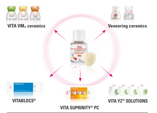 CHROMA STAINS sú dofarbovacie materiály na keramiku pre všetku štandardnú fazetovaciu keramiku, monolitickú zirkónovú keramiku, silikátovú alebo živcovú keramiku.