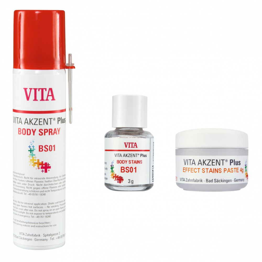 Pomocou VITA AKZENT Plus môžu používatelia optimalizovať odtieň všetkých typov náhrad dentálnej keramiky jednoducho a efektívne, bez ohľadu na CTE náhrady. Nezáleží na tom, či ide o vnútorné sfarbenie, charakterizáciu povrchu alebo jemné zasklenie: s novými fluorescenčnými VITA AKZENT Plus to zvládnete ľahko a bez zbytočného úsilia. V závislosti na preferovanom / obvyklom spôsobe spracovania a príslušnej oblasti použitia sú VITA AKZENT Plus dostupné ako prášky a pasty pripravené na použitie. BODY STAINS a materiál GLAZE sú k dispozícii aj v spreji, ktorý vďaka rovnomernej aplikácii zaisťuje rovnomerné povrchové ošetrenie na veľkej ploche bez akýchkoľvek strát v dôsledku rozptylu. Nová špeciálna striekacia hlava umožňuje presné nanášanie na konkrétne oblasti.