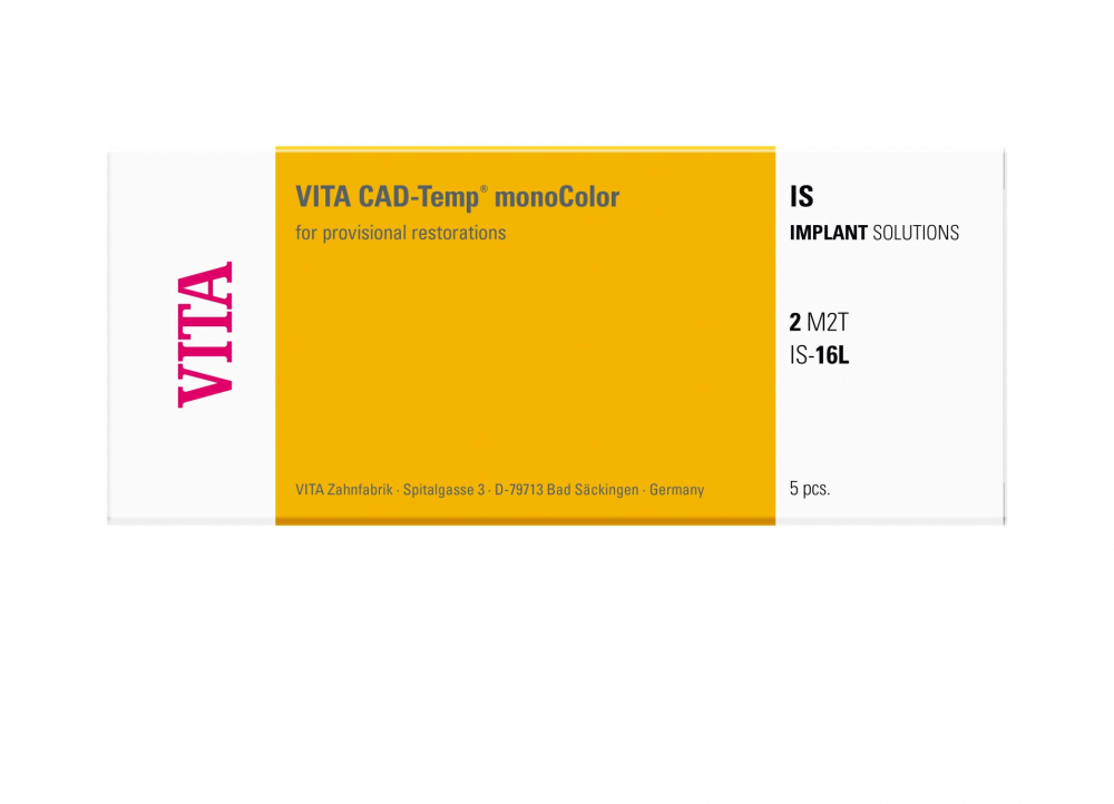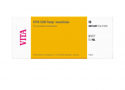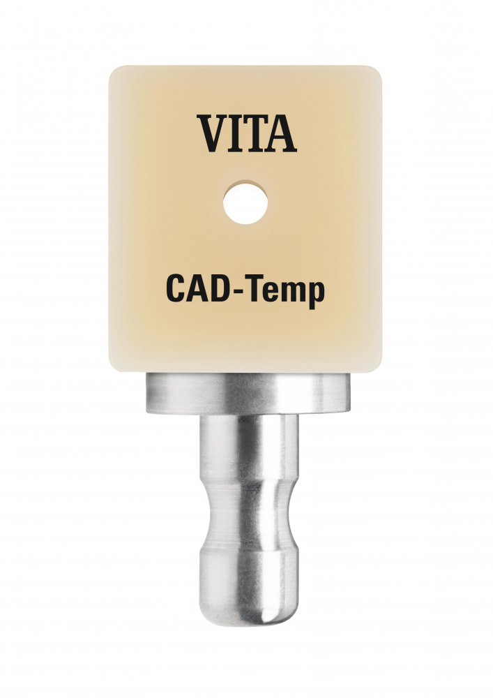 Bloky z kompozitu, ktoré sa vyznačujú integrovaným rozhraním (otvorom) pre adhezívnu / titánovú bázu k dispozícii ako kompozit VITA CAD-Temp IS na dočasné náhrady.