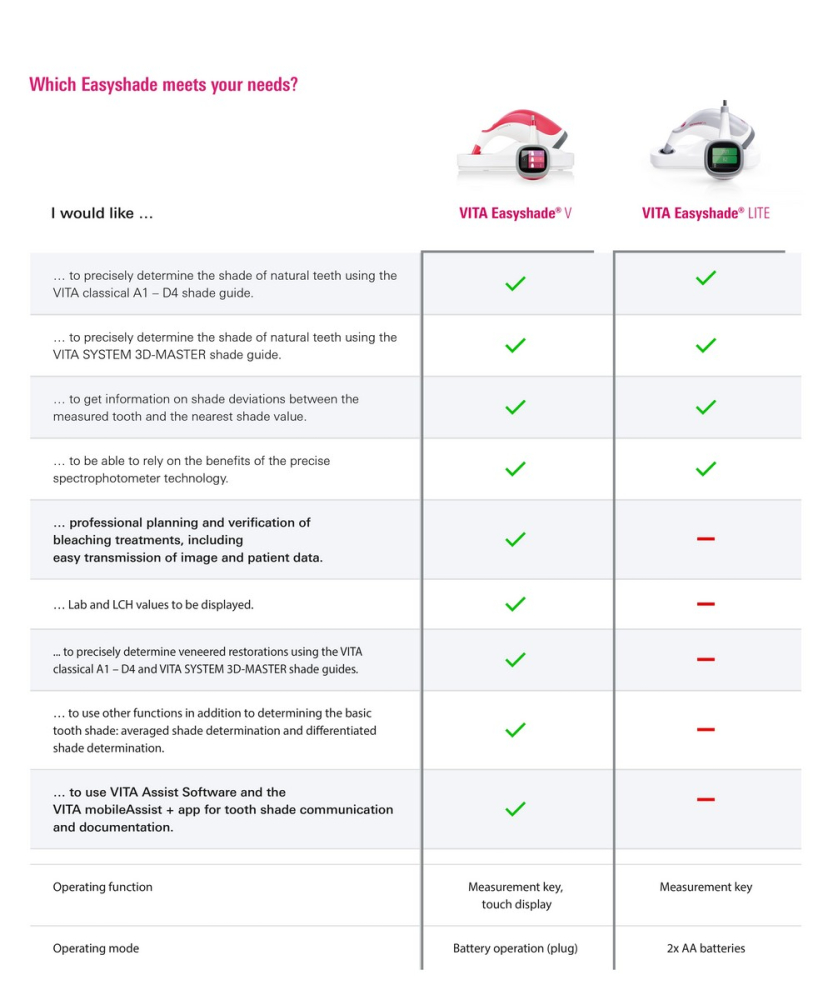 Ručný prístroj VITA Easyshade LITE umožňuje jednoduché a rýchle digitálne určenie odtieňa pre prirodzenú farbu chrupu pomocou osvedčených systémov odtieňov VITA Classic A1-D4 a VITA SYSTEM 3D-MASTER.