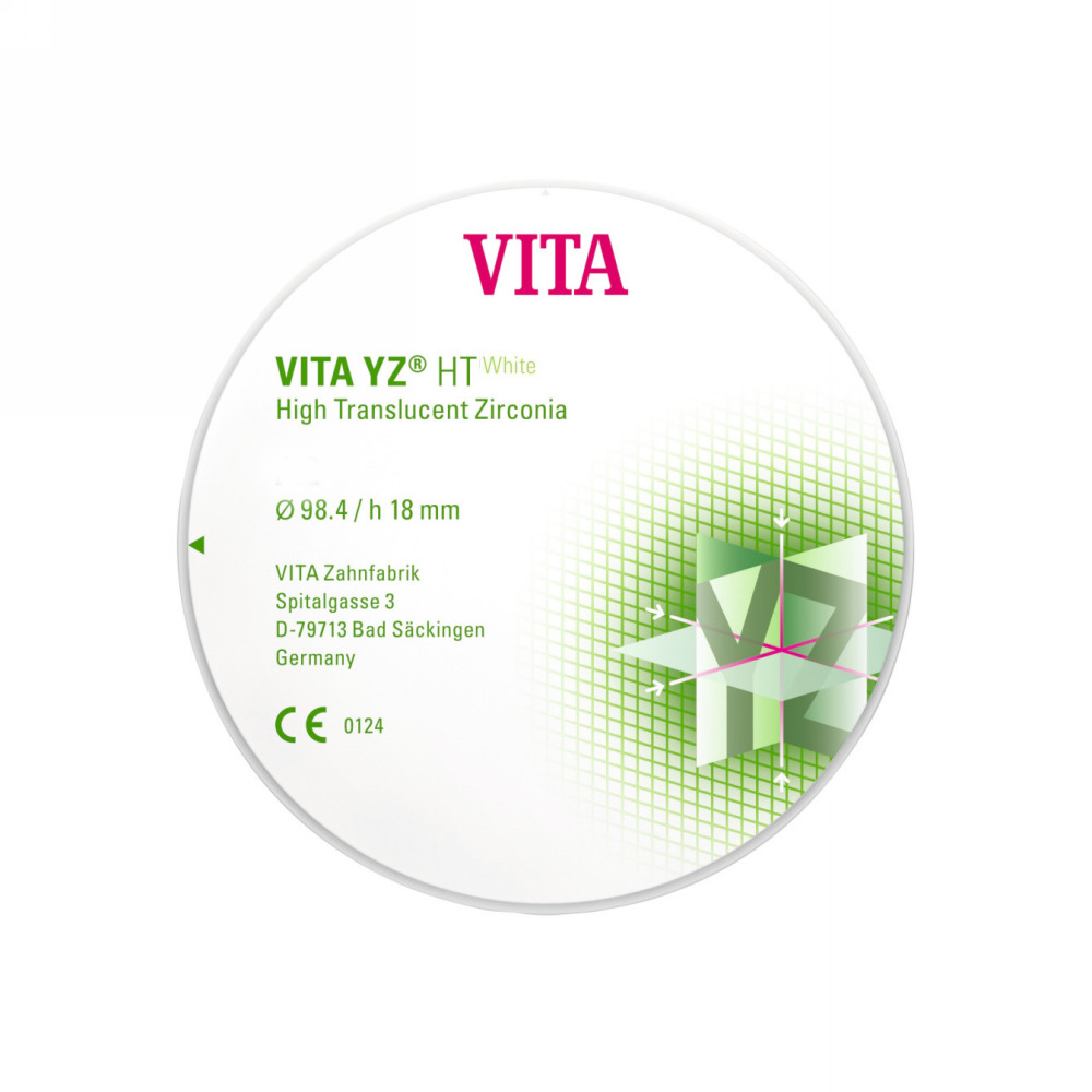 VITA YZ HT sú vysoko priesvitné disky zo ZrO2 na výrobu prirodzených, individuálnych, plne fazetovaných subštruktúr, verzia White je bezfarebná, na manuálne dofarbenie pomocou VITA YZ HT SHADE LIQUIDS.