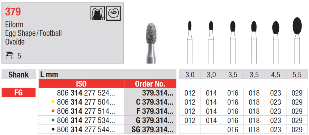 Diamantový vrták s pracovnou časťou v tvare vajíčka, 379 / C 379 žltá / F 379 červená / G 379 zelená / SG 379 čierna, mandrel FG, veľkosti 012 až 029. viac o produkte