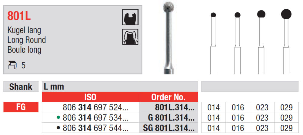 Diamantový vrták s pracovnou časťou v tvare guľôčky a predĺženým driekom, 801 / G801 zelená / SG 801 čierna, mandrel FG, veľkosti od 014 do 029.