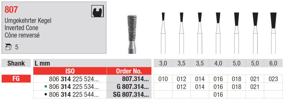 Diamantový vrták s pracovnou časťou v tvare obráteného kužeľa, 807 / G 807 zelená / SG 807 čierna, mandrel FG, veľkosti od 010 do 023. viac o produkte