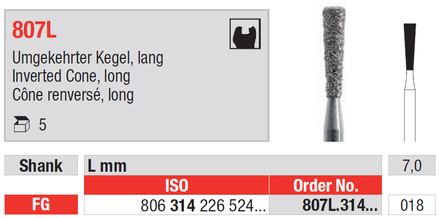 Diamantový vrták s pracovnou časťou v tvare dlhého obráteného kužeľa, mandrel FG, veľkosť 018 (SG807L 018 a 023 vo výpredaji).