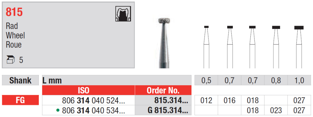 Diamantový vrták s pracovnou časťou v tvare kolieska, 815 / G 815 zelená, mandrel FG, veľkosti 012 až 027 viac o produkte