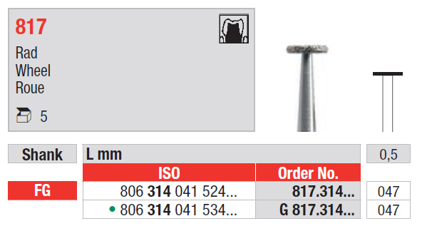 Diamantový vrták – fréza na rezanie koruniek v tvare kolieska, 817 / G 817 zelená, mandrel FG, veľkosť 047.
