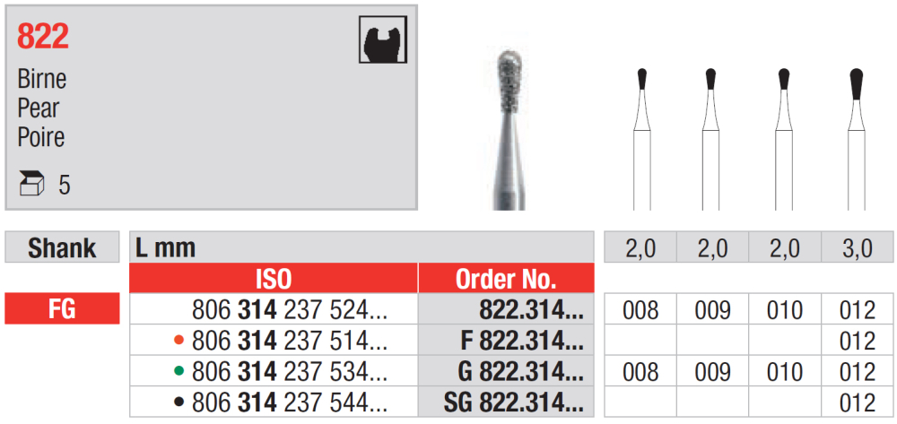 Diamantový vrták s pracovnou časťou v tvare hrušky, 822 / F 822 červená / G 822 zelená / SG 822 čierna, mandrel FG, veľkosti 008 a 012.