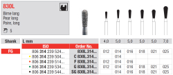 Diamantový vrták s pracovnou časťou v tvare predĺženej hrušky, 830L / C 830L žltá / F 830L červená / G 830L zelená / SG 830L čierna, mandrel FG, veľkosti 012 a 025.