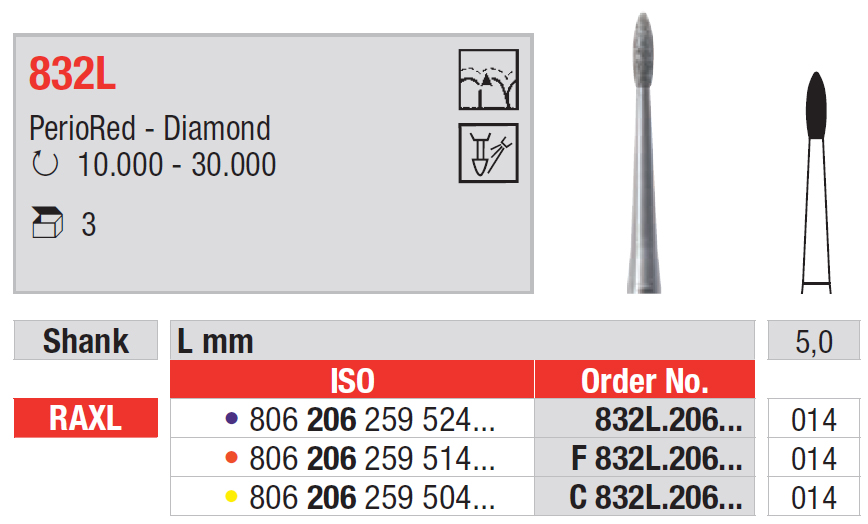 Diamantový vrtáčik parodontologický PerioRed, modrá 832L, červená F832L, žltá C832L, veľkosť 014, mandrel RAXL viac o produkte