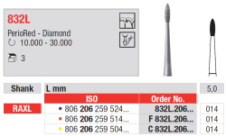 Diamantový vrtáčik parodontologický PerioRed, modrá 832L, červená F832L, žltá C832L, veľkosť 014, mandrel RAXL.
