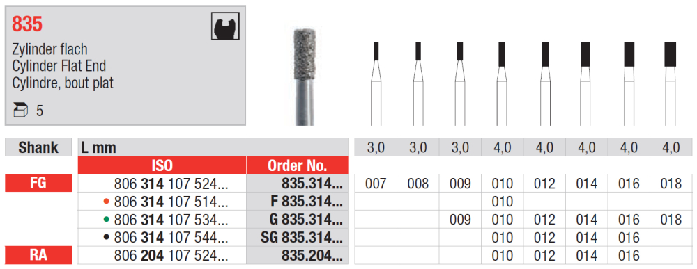Diamantový vrták s pracovnou časťou v tvare valca s plochým koncom, 835 / F 835 červená / G 835 zelená / SG 835 čierna, mandrel FG/RA, veľkosti od 007 do 018. viac o produkte