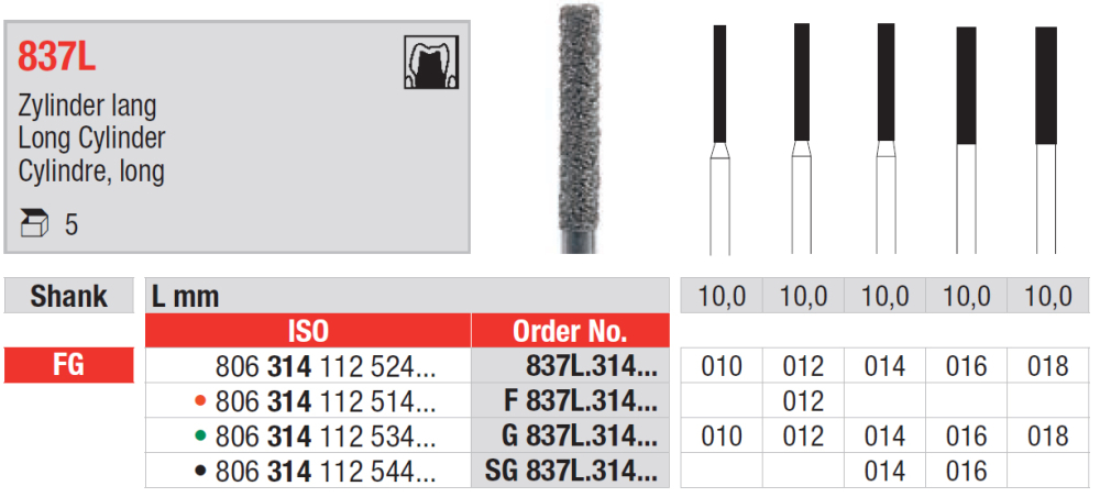 Diamantový vrták s pracovnou časťou v tvare predĺženého valca, 837L / F 837L červená / G 837L zelená / SG 837L čierna, mandrel FG, veľkosti 010 až 018.