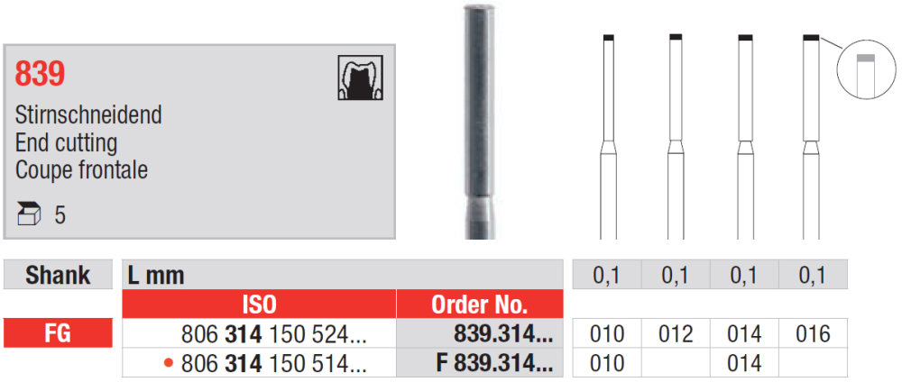 Diamantový vrták s pracovnou časťou určenou na rezanie, 839 / F 838 červená (C 839 žltá výpredaj), mandrel FG, veľkosti od 010 do 016. viac o produkte