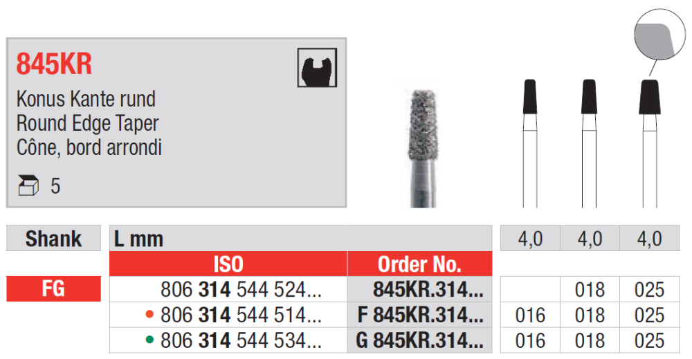 Diamantový vrták s pracovnou časťou v tvare kónusu, kužeľa so zaobleným koncom, 845KR / F 845KR červená / G 845KR zelená, mandrel FG, veľkosti od 016 do 025.