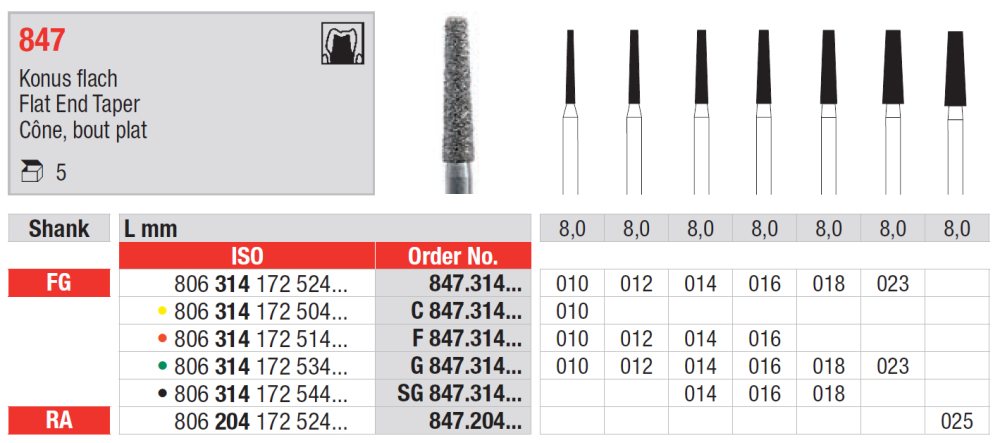 Diamantový vrták s pracovnou časťou v tvare valca s plochým koncom, 847 / C 847 žltá / F 847 červená / G 847 zelená / SG 847 čierna, mandrel FG/RA, veľkosti od 010 do 025. viac o produkte