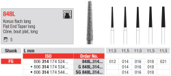 Diamantový vrták s predĺženou pracovnou časťou v tvare kónusu, kužeľa s plochým koncom, 848L / G 848L zelená / SG 848L čierna, mandrel FG, veľkosti od 012 do 021.