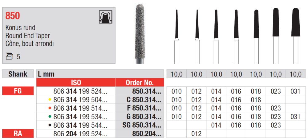 Diamantový vrták s pracovnou časťou v tvare kónusu, kužeľa s oblým koncom, 50 / C 850 žltá / F 850 červená / G 850 zelená / SG 850 čierna, mandrel FG/RA, veľkosti od 010 do 031.