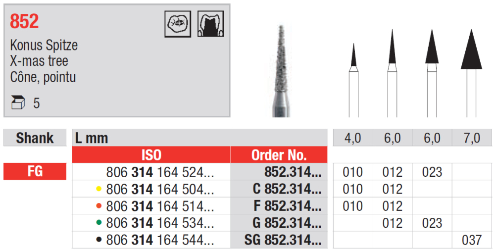 Diamantový vrták s pracovnou časťou v tvare kužeľa, kónusu so špicom (vianočný stromček), 852 / C 852 žltá / F 852 červená / G 852 zelená / SG 852 čierna, mandrel FG, veľkosti od 010 do 037.