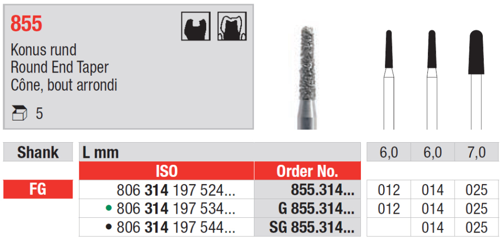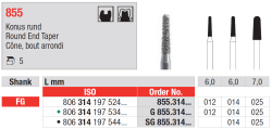 Diamantový vrták s pracovnou časťou v tvare kónusu, kužeľa s oblým koncom, 855 / F 855 červená / G 855 zelená / SG 855 čierna, mandrel FG, veľkosti od 014 do 020. viac o produkte