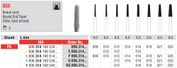 Diamantový vrták s pracovnou časťou v tvare kónusu, kužeľa s oblým koncom, 856 / C 856 žltá / F 856 červená / G 856 zelená / SG 856 čierna, mandrel FG, veľkosti od 009 do 025.