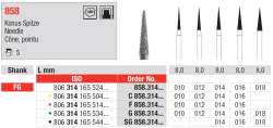 Diamantový vrták s pracovnou časťou v tvare ihly – kónusu, kužeľa s ostrým špicom, 858 / C 858 žltá / F 858 červená / G 858 zelená / SG 858 čierna, mandrel FG, veľkosti 010 až 018. viac o produkte