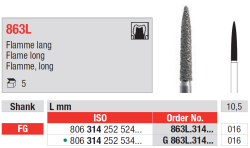 Diamantový vrták s pracovnou časťou v tvare dlhého plamienka, 863L / G 866L zelená, mandrel FG, veľkosť 016. viac o produkte