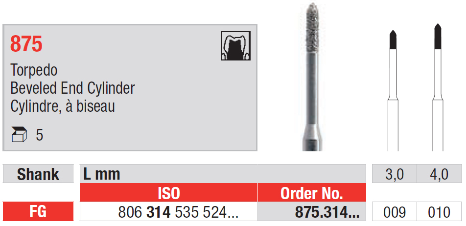 Diamantový vrták s pracovnou časťou v tvare valca so skoseným koncom (torpédo), mandrel FG, veľkosti 009 a 010. viac o produkte