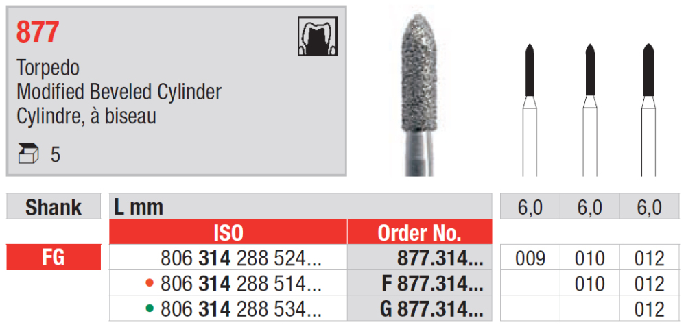 Diamantový vrták s pracovnou časťou v tvare valca so skoseným koncom (torpédo), mandrel FG, veľkosti 009 až 012.